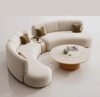 Muebles de doble asiento Sofá de asiento de amor blanco Sofá de cojín de tela de círculo de luna de madera